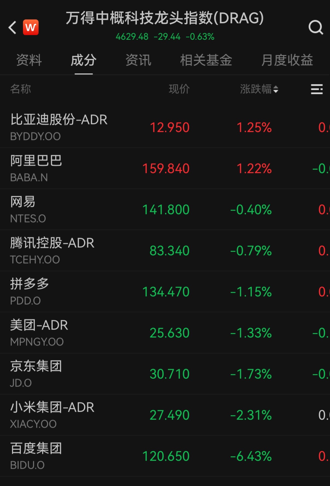 中概股涨跌不一。纳斯达克中国金龙指数收跌1.59%,万得中概科技龙头指数跌0.63%。比亚迪股份-ADR、阿里巴巴逆势上涨,分别涨1.25%、1.22%。百度集团大跌逾6%,小米集团-ADR跌超2%,京东集团、美团-ADR、拼多多跌超1%。
