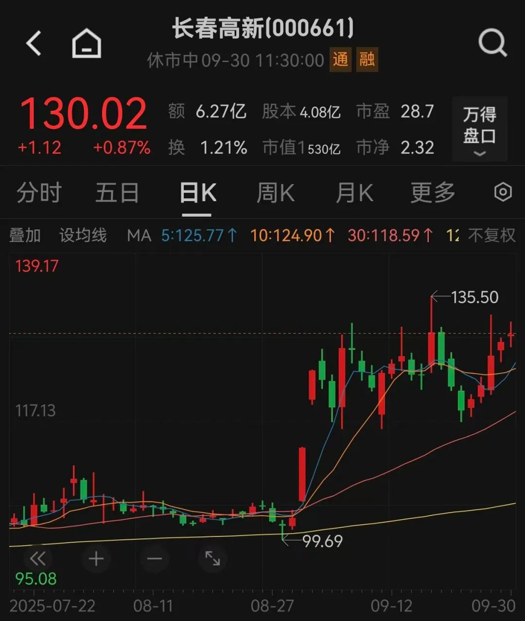 Wind数据显示,截至9月30日上午收盘,长春高新涨0.87%,报130.02元/股,最新市值为530亿元。