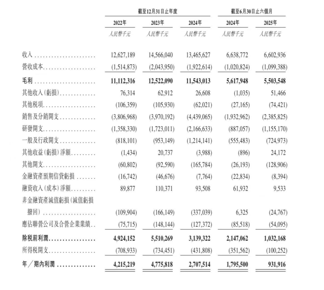 招股书显示,2022年、2023年、2024年及2025年上半年,长春高新分别实现营收126.27亿元、145.66亿元、134.66亿元、66.03亿元,毛利率分别为88%、86%、85.7%、83.4%。