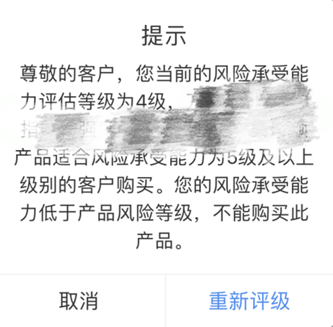 北京市西城区的投资者安吉(化名)表示,她在某股份制银行的风险评级为A3稳健型。今年2月末,她通过该行的手机银行APP定投了一款R5风险评级的基金产品。在操作过程中,该行只是向她发送了关于超出风险评级购买的提示短信,表明若未重新进行风险评估,定投计划将继续执行。
