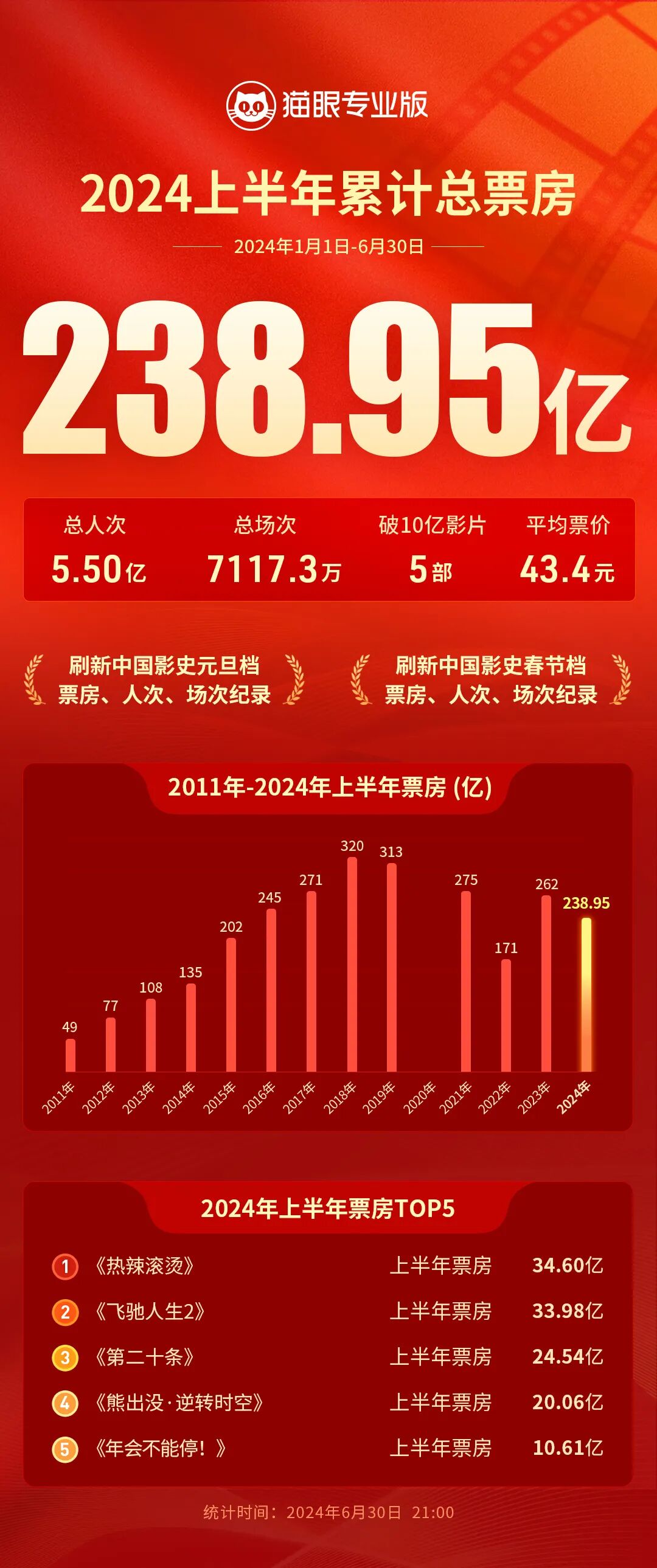 据猫眼专业版数据,截至6月30日21时,2024年上半年(2024年1月1日—6月30日)累计总票房238.95亿元,观影人次5.50亿人,放映场次7117.3万场,平均票价为43.4元,5部影片票房破10亿元。