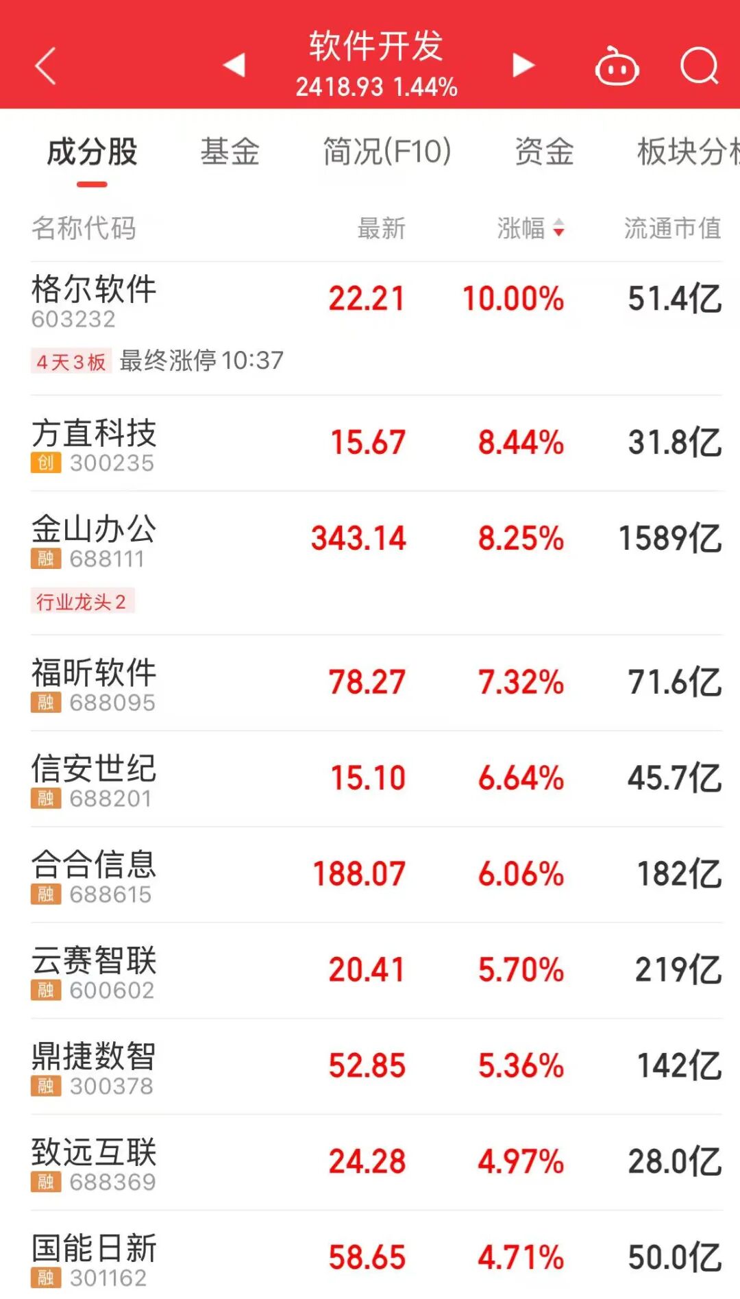 今天上午,软件概念板块表现活跃,云办公、软件开发、电子身份证等板块涨幅居前。龙头股金山办公涨超8%。