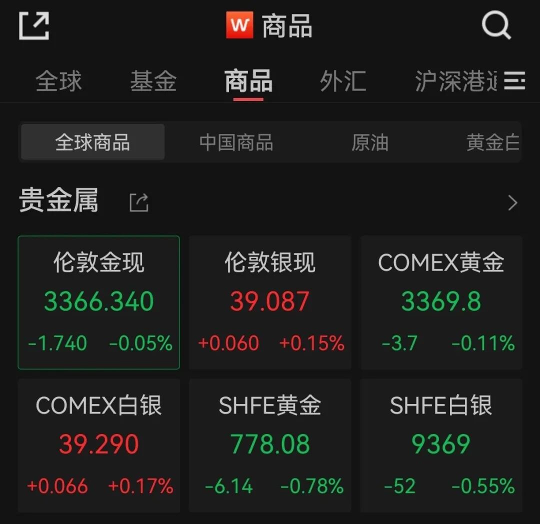 国际贵金属期货普遍收跌。Wind数据显示,截至7月24日收盘,伦敦现货黄金、COMEX黄金期货分别跌0.55%、0.77%,报3368.08美元/盎司、3371.3美元/盎司。