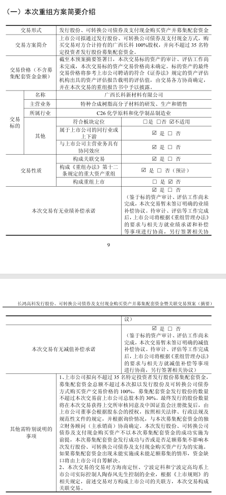 7月18日,长鸿高科披露《宁波长鸿高分子科技股份有限公司发行股份、可转换公司债券及支付现金购买资产并募集配套资金暨关联交易预案》(下称“关联交易预案”)。