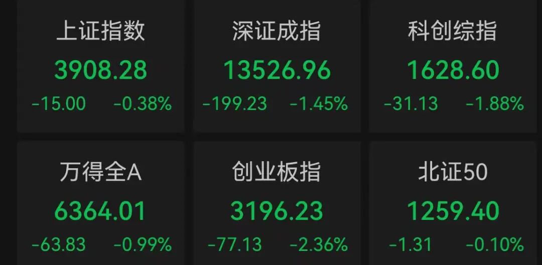 截至上午收盘,上证指数下跌0.38%,深证成指下跌1.45%,创业板指下跌2.36%,科创综指下跌1.88%。