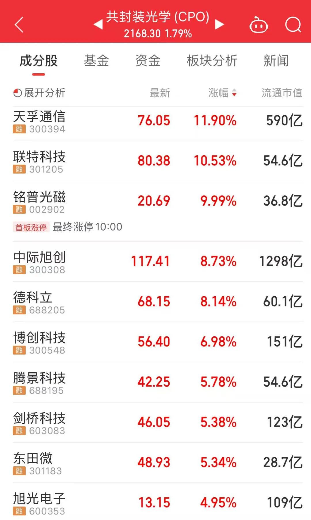 中际旭创、天孚通信、博创科技、德科立等龙头股大涨,其中,中际旭创(300308)上涨8.73%,最新市值为1305亿元;成交额为77.23亿元,居A股第一。