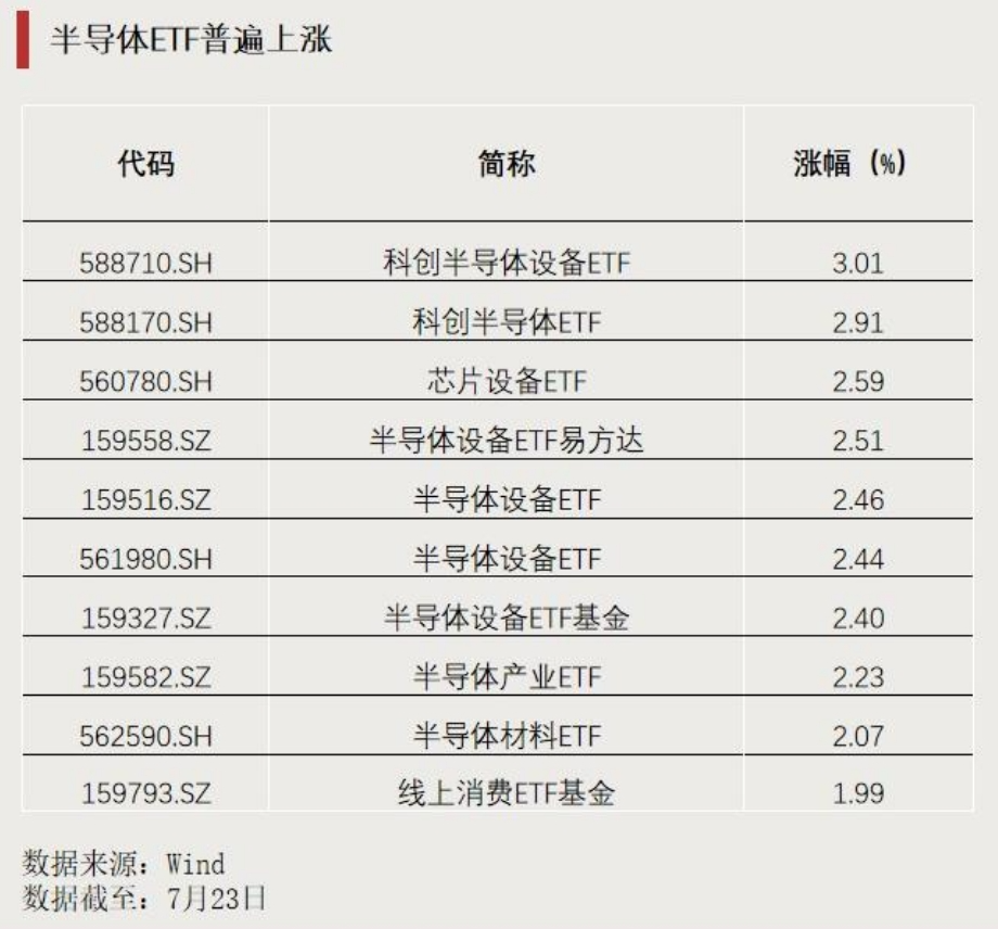 7月23日,大盘宽幅震荡,早盘大金融板块带动上证指数一度突破3600点。午后,三大股指相继回落,截至收盘,深证成指、创业板指均微跌,上证指数上涨0.01%,报3582.3点。证券、银行、半导体等行业板块涨幅居前。A股ETF中,半导体相关ETF领涨,截至收盘,多只涨超2%。
