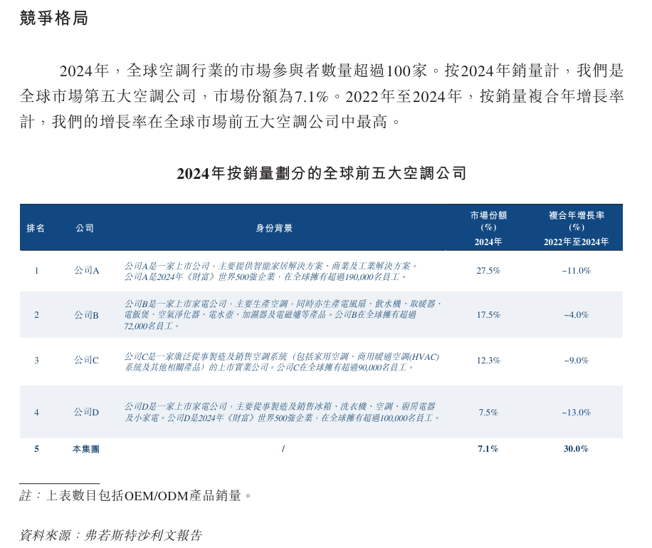 根据弗若斯特沙利文统计,2024年,按销量计算,公司是全球第五大空调提供商,市场份额达7.1%。