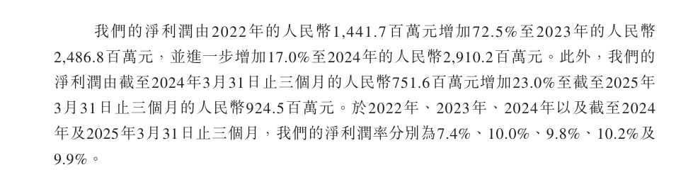 此外,公司的净利润由截至2024年一季度的约7.52亿元增加23.0%至截至2025年一季度的约9.25亿元。2022年、2023年、2024年以及2025年一季度,公司的净利润率分别为7.4%、10.0%、9.8%及9.9%。