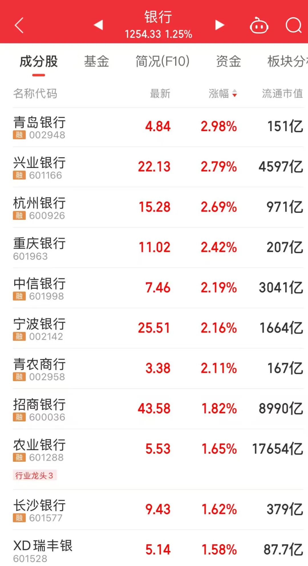 银行板块中,青岛银行、兴业银行等个股涨幅居前。