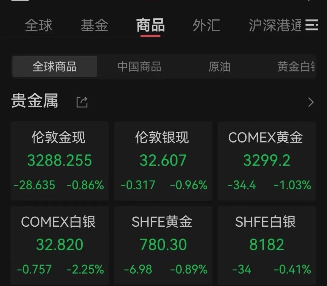 大宗商品市场方面,伦敦现货黄金、COMEX黄金期货价格双双跌破3300美元/盎司。截至北京时间5月1日6:00,伦敦现货黄金价格报3288.255美元/盎司,跌0.86%;COMEX黄金期货报3299.2美元/盎司,跌1.03%。