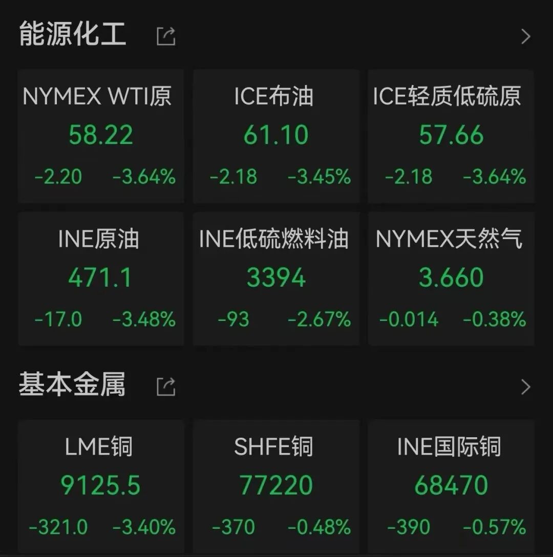 截至北京时间5月1日6:00,伦敦现货黄金、COMEX黄金期货价格双双跌破3300美元/盎司;WTI原油期货、布伦特原油期货价格跌幅均超3%;LME期铜跌超3%。