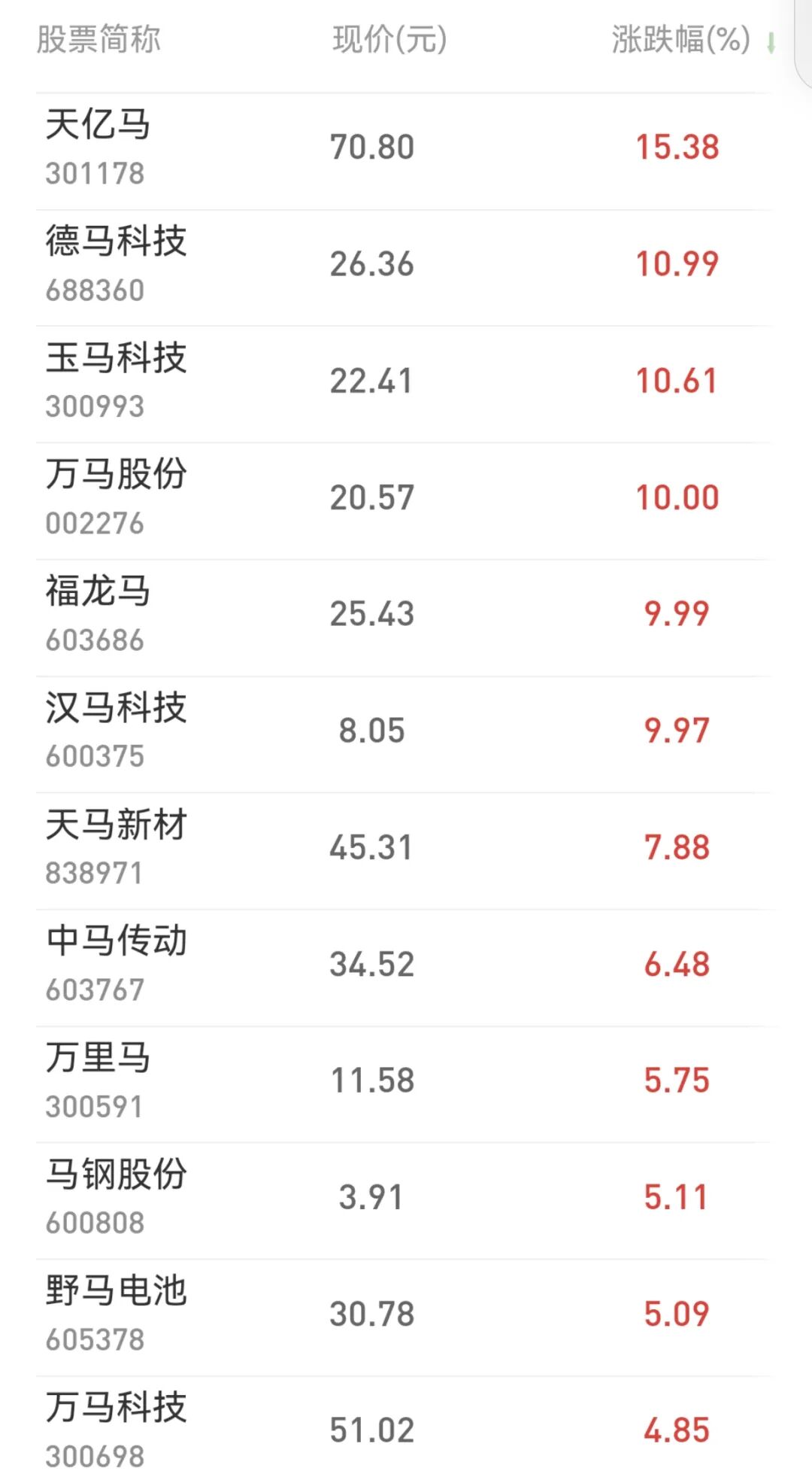 今天,多只名称中带“马”字的个股上涨。其中,天亿马、德马科技、玉马科技等大涨。