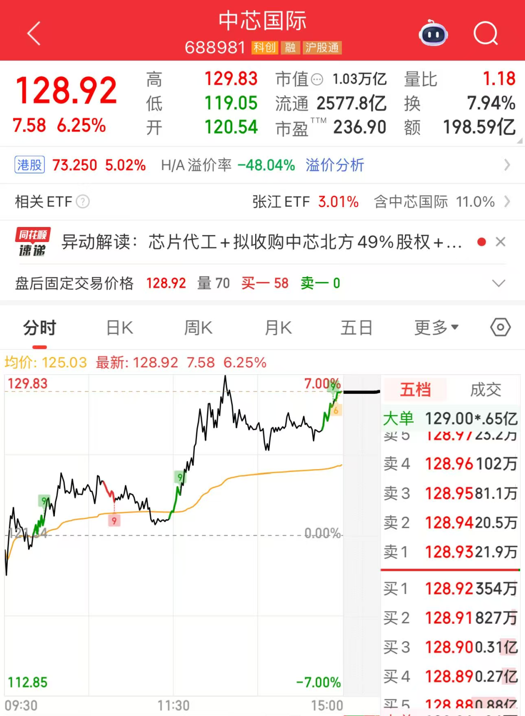 芯片产业链反复活跃,德明利“2连板”创历史新高,海光信息涨近11%,创历史新高;中芯国际涨超6%,最新市值达1.03万亿元,股价创历史新高,成交额近200亿元,居A股第一。