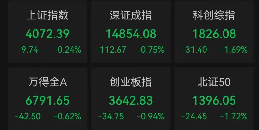 上午收盘,上证指数下跌0.24%,深证成指下跌0.75%,创业板指下跌0.94%,科创综指下跌1.69%。