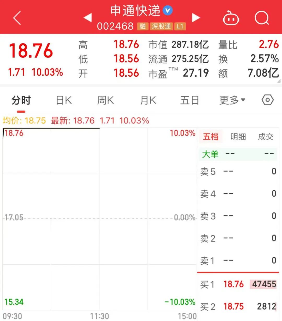 物流、半导体、影视院线、煤炭、工程机械等板块上涨。物流龙头股申通快递开盘秒涨停,半导体概念股中芯国际、澜起科技、中微公司等龙头股上涨。