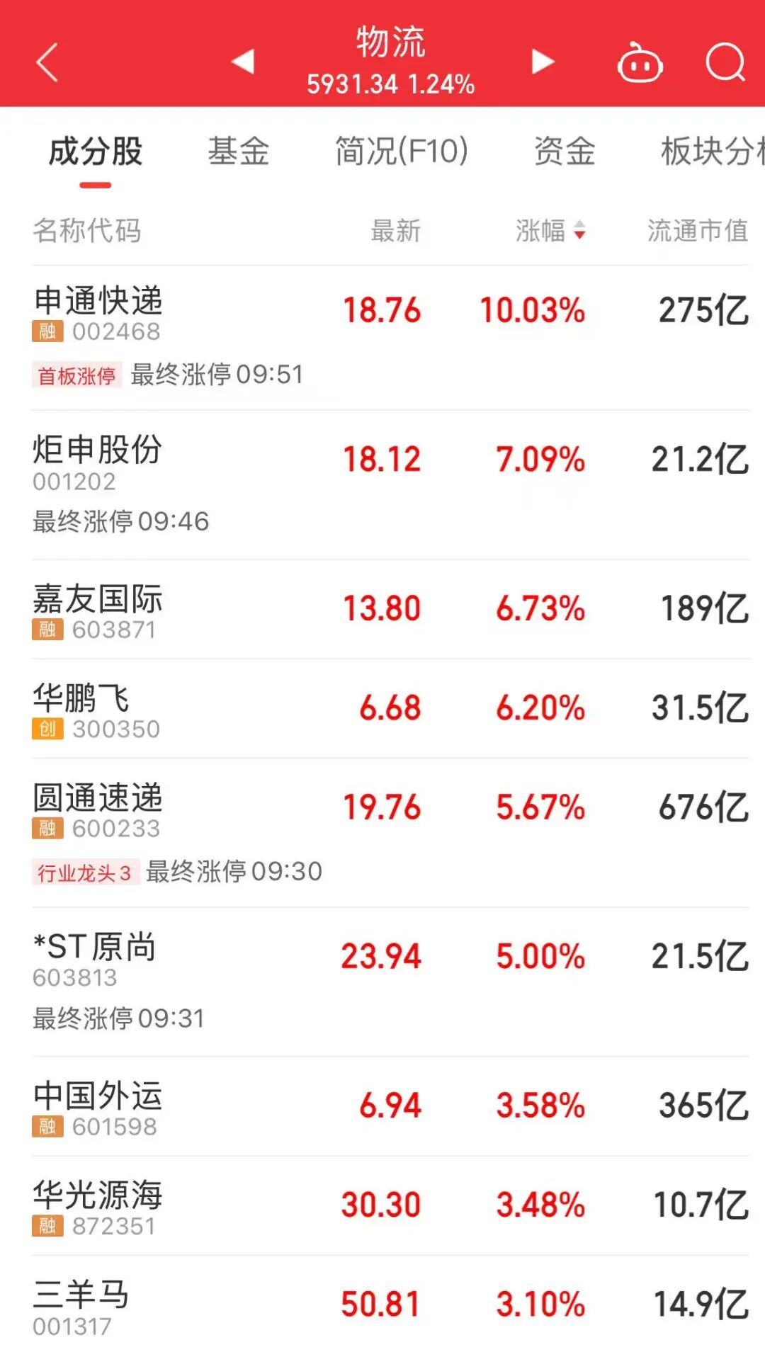 今天上午,物流板块上涨,龙头股申通快递早上开盘秒涨停,华鹏飞、圆通速递等个股也大涨。