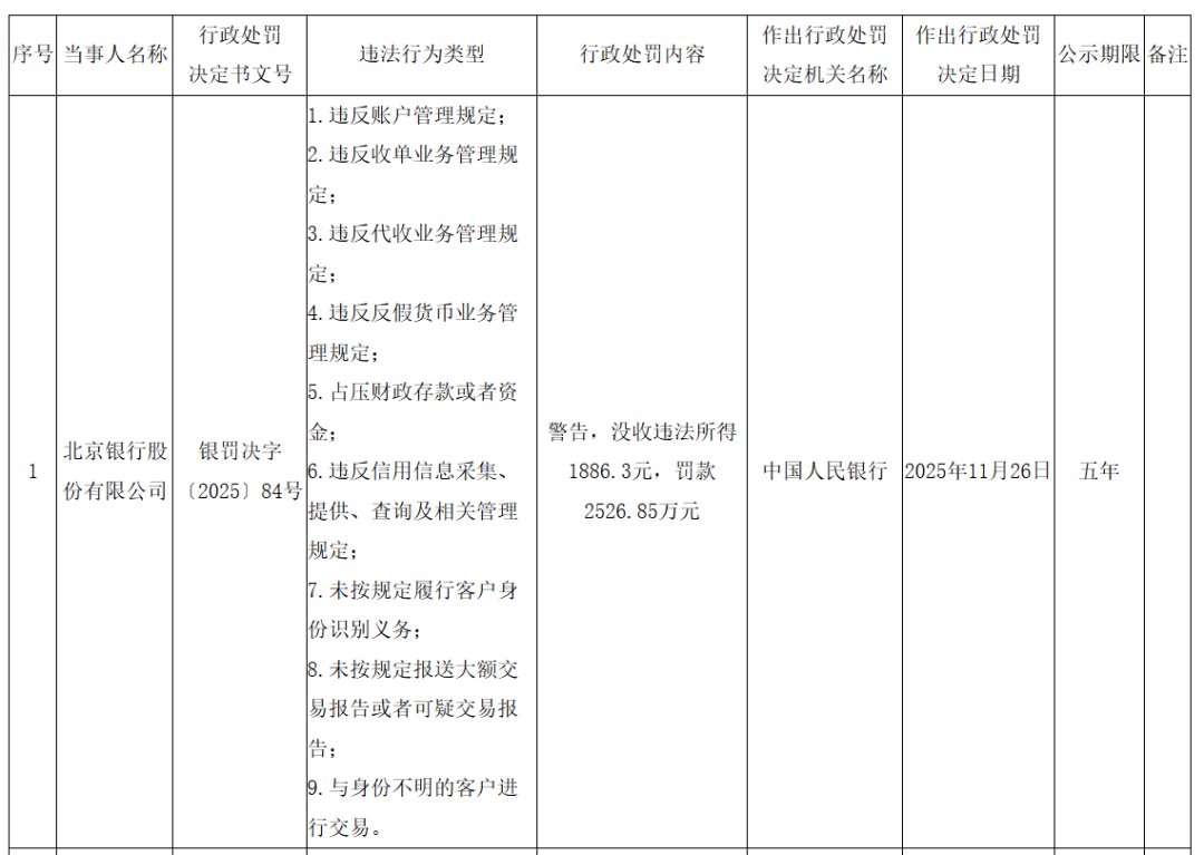 11月28日,中国人民银行发布的行政处罚公示显示,北京银行因9项违法行为被中国人民银行处以警告,并没收违法所得1886.3元,罚款2526.85万元。华夏银行因10项事由被没收违法所得15.456791万元,罚款1365.5万元。两家银行均有多名相关责任人被处以警告、罚款等行政处罚。
