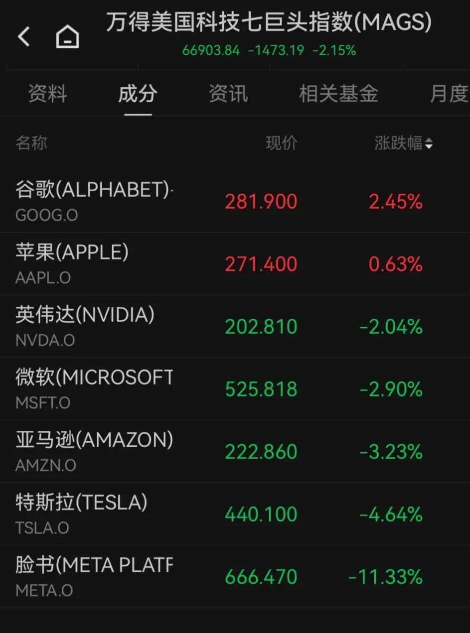 大型科技股多数下跌,万得美国科技七巨头指数下跌2.15%。个股方面,META跌超11%,特斯拉跌超4%,亚马逊跌逾3%,微软跌近3%,英伟达跌超2%,苹果小幅上涨,谷歌-C涨超2%。