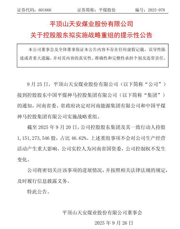 平煤股份9月25日晚间公告称,公司接到控股股东中国平煤神马集团通知,河南省委、省政府决定对河南能源集团和中国平煤神马集团实施战略重组。截至9月20日,中国平煤神马集团及其一致行动人持股约为11.51亿股,占比46.62%。上述重组事项不会对公司生产经营活动产生重大影响。公司实控人为河南省国资委,公司控制权不发生变化。