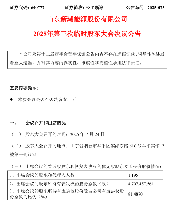 7月24日下午,*ST新潮临时股东大会在山东烟台牟平宾馆召开。此次股东大会是在新晋第一大股东伊泰B股向现任董监事会提出“提前换届”诉求屡次遭拒后,由6位中小股东自行召集举行的。这也是2025年A股上市公司中首例由中小股东自行召集的股东大会。