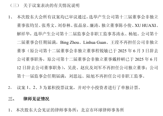 会议采用现场投票与网络投票相结合的方式进行,出席会议的股东及代理人共1195人,代表有表决权股份4707457561股,占公司有表决权股份总数的81.487%,会上,《关于董事会提前换届并选举公司第十三届董事会非独立董事的议案》、《关于董事会提前换届并选举公司第十三届董事会独立董事的议案》等全部议案均获得通过。