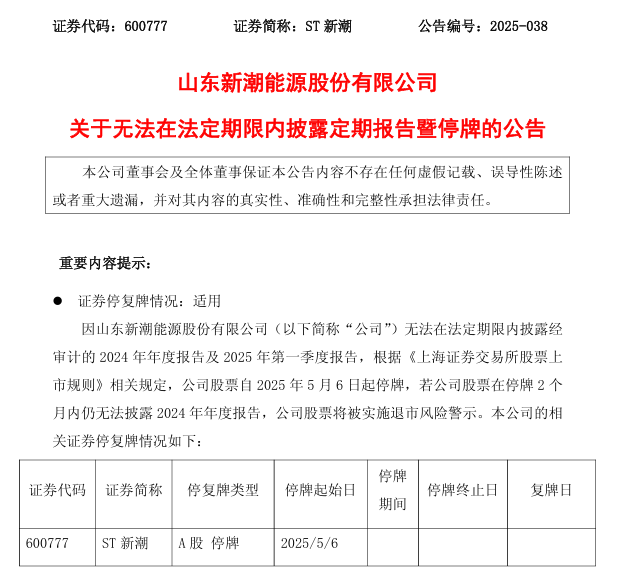 4月30日,公司披露关于无法在法定期限内披露定期报告暨停牌的公告。按照相关规定,公司在股票停牌后两个月内仍未披露2024年年度报告的,将被实施退市风险警示;如公司股票交易被实施退市风险警示之日起两个月内仍未披露过半数董事保证真实性、准确性和完整性的2024年年度报告,公司股票将被终止上市。