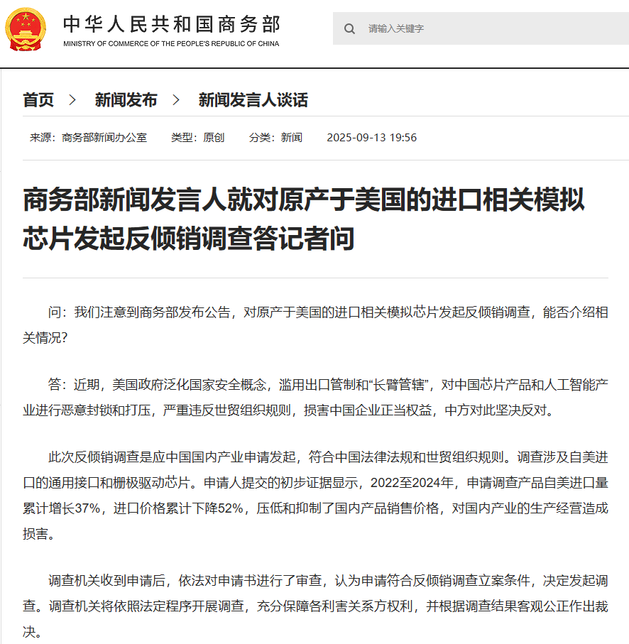 商务部新闻发言人就对原产于美国的进口相关模拟芯片发起反倾销调查答记者问
