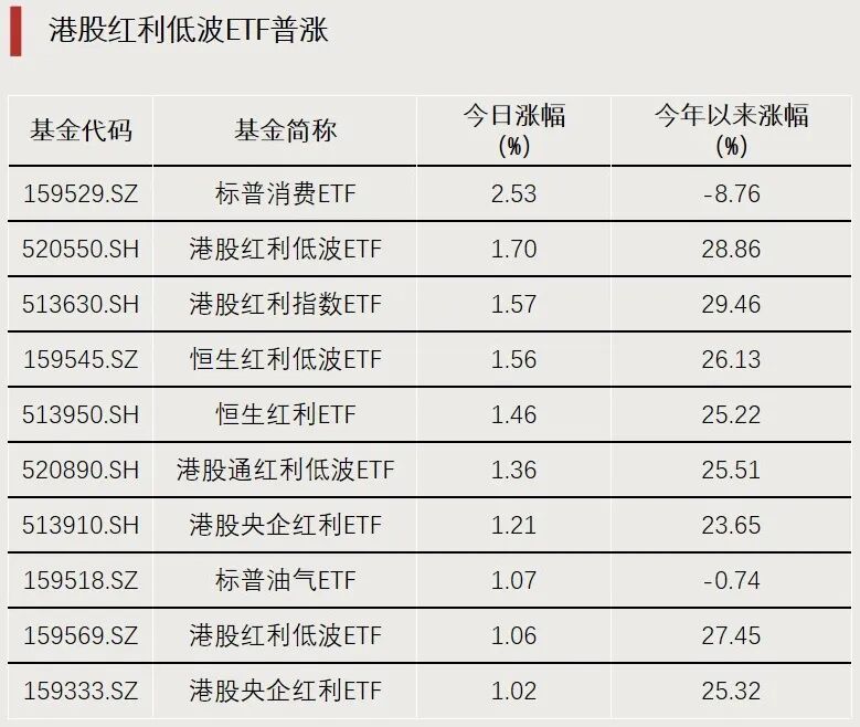 受机构投资者锁定收益、年底出现政策与数据空窗期等影响,现金流稳定、高分红的红利板块受追捧,港股红利ETF今日普遍上涨。