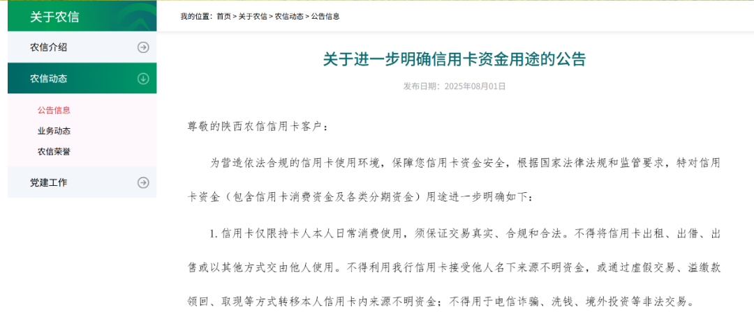早在8月1日,陕西省农村信用社联合社便已发布关于进一步明确信用卡资金用途的公告。公告称,为营造依法合规的信用卡使用环境,保障客户信用卡资金安全,特对信用卡资金(包含信用卡消费资金及各类分期资金)用途进一步明确,其中明确了9项用途。随后,西安银行、凤翔农商行、渭滨农商行等多家陕西地区银行陆续跟进,发布相关公告。