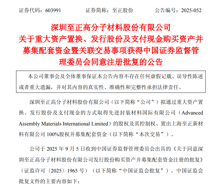 9月5日晚,至正股份公告称,中国证监会同意公司通过重大资产置换、发行股份及支付现金的方式取得先进封装材料国际有限公司(AAMI)的股权及其控制权、置出上海至正新材料有限公司100%股权并募集配套资金。