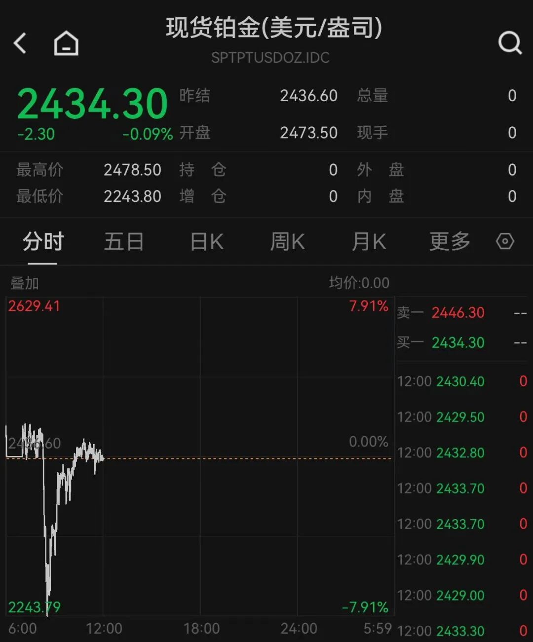 铂金价格盘中跳水,一度跌近8%,随后跌幅收窄。截至北京时间12月29日12:00,报2434.30美元/盎司,跌0.09%。