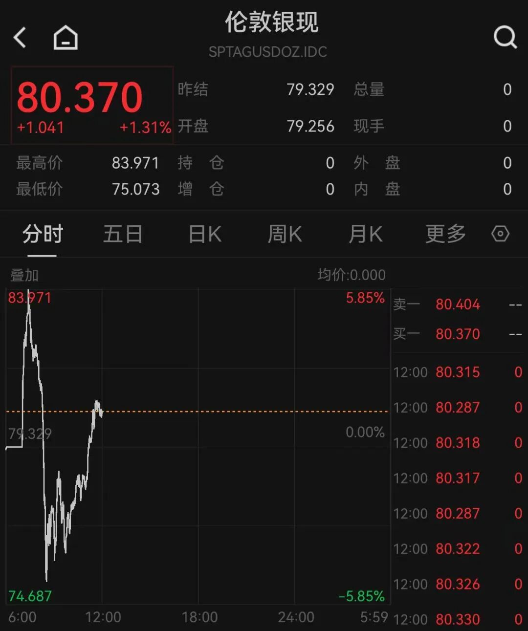 Wind数据显示,伦敦现货白银在大涨超5%逼近84美元/盎司的历史新高后直线走低,一度转跌超3%,随后逐步拉升。截至北京时间12月29日12:00,报80.37美元/盎司,涨1.31%。