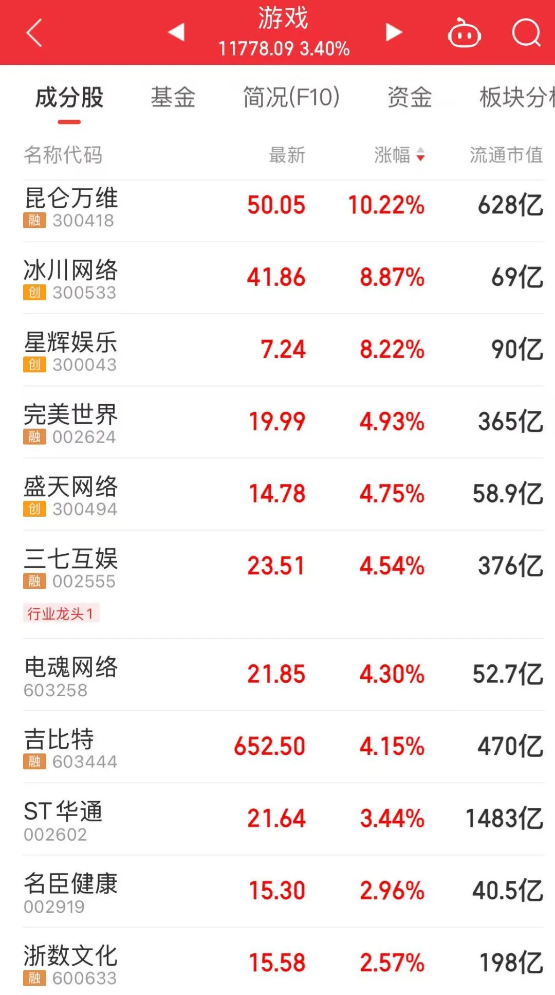 今天上午,游戏板块大涨,昆仑万维、冰川网络等个股大涨。