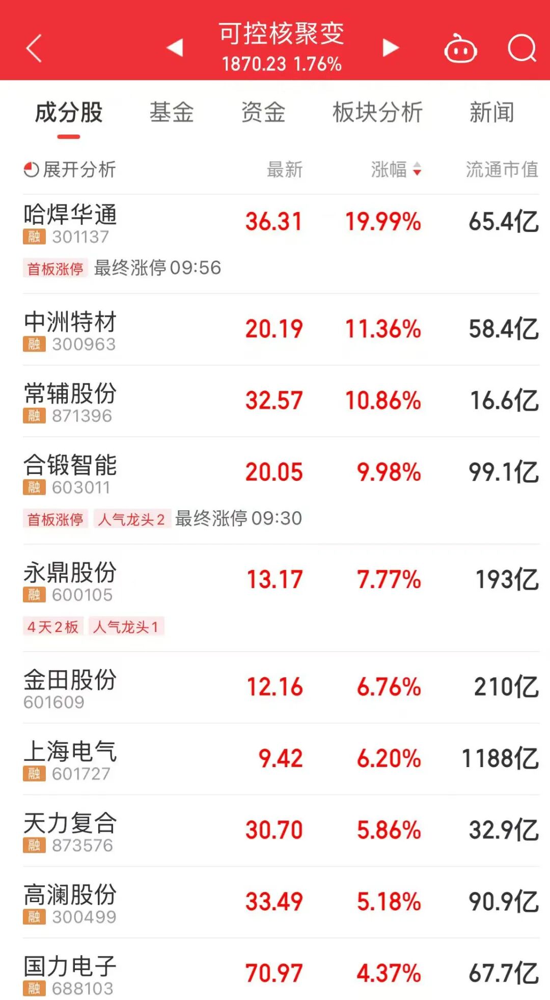 今天上午,可控核聚变板块上涨,哈焊华通、中洲特材、常辅股份等个股大涨。