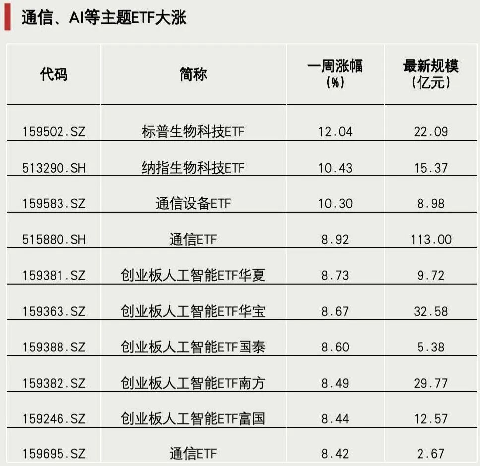 上周(11月24日至11月28日),以算力为首的科技板块继续保持强劲势头,多只通信、创业板人工智能主题ETF涨超8%。