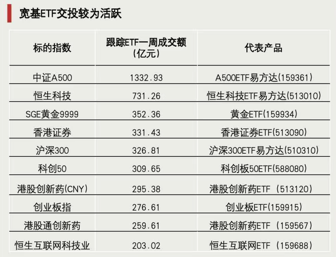 受近期市场震荡影响,宽基ETF交投显著活跃,A500ETF易方达(159361)等跟踪中证A500指数的ETF上周合计成交额超1300亿元,领先于其他股票指数。