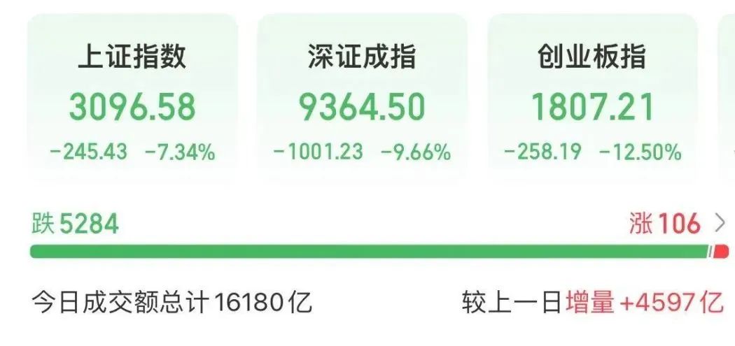 今天A股三大指数集体回调。截至收盘,上证指数下跌7.34%,深证成指下跌9.66%,创业板指下跌12.5%。全市场全天成交额16180亿元,较上个交易日放量4597亿元。