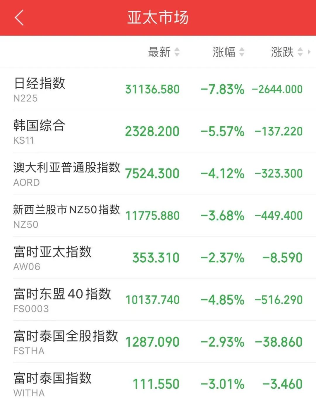 此外,欧洲股市开盘也出现大跌,欧洲斯托克50指数开盘下跌6.2%,德国DAX指数下跌7.1%,英国富时100指数下跌4.1%,意大利富时MIB指数跌7.4%,西班牙IBEX35指数跌4.9%。