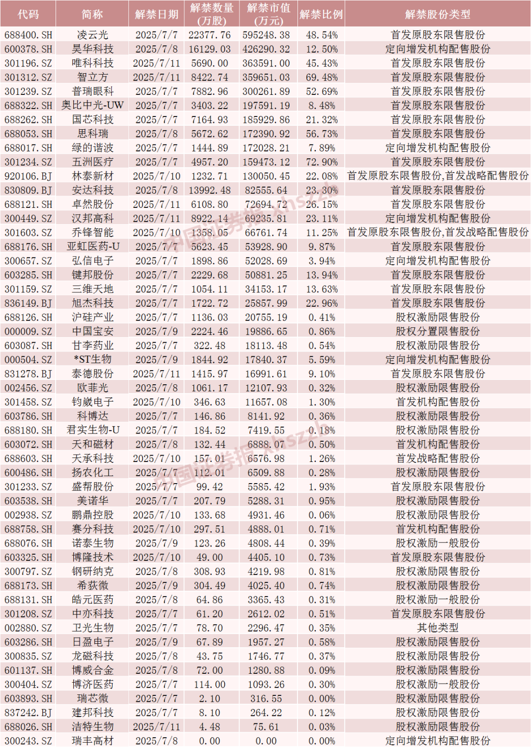 具体来看,Wind数据显示,凌云光7月7日将解禁2.24亿股,均为首发原股东限售股份。昊华科技7月8日将解禁1.61亿股,均为定向增发机构配售股份。唯科科技7月11日将解禁5690万股,均为首发原股东限售股份。