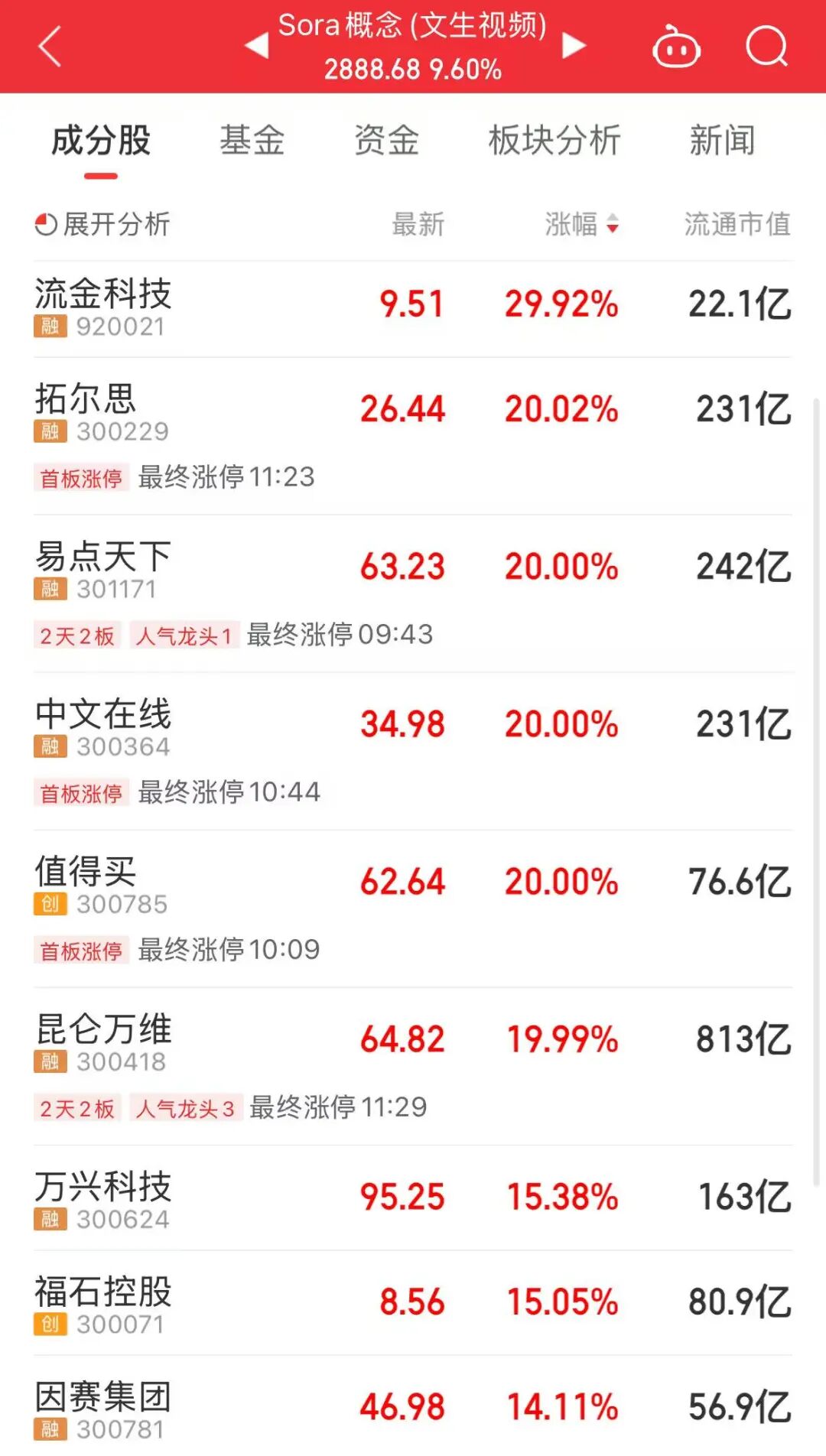 今天上午,AI应用主线大爆发,Sora概念、AI+营销、AI智能体等板块大涨。两大龙头股蓝色光标、昆仑万维均迎来“20CM”涨停,蓝色光标成交额为193.2亿元,居A股第一。