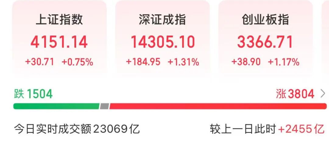 总体看,上午市场确立了“AI应用、商业航天”双主线的格局。截至上午收盘,上证指数上涨0.75%,深证成指上涨1.31%,创业板指上涨1.17%。