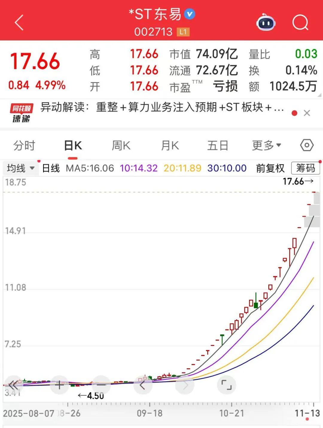 Wind数据显示,截至11月13日收盘,*ST东易股价报17.66元/股,收获“12连板”。